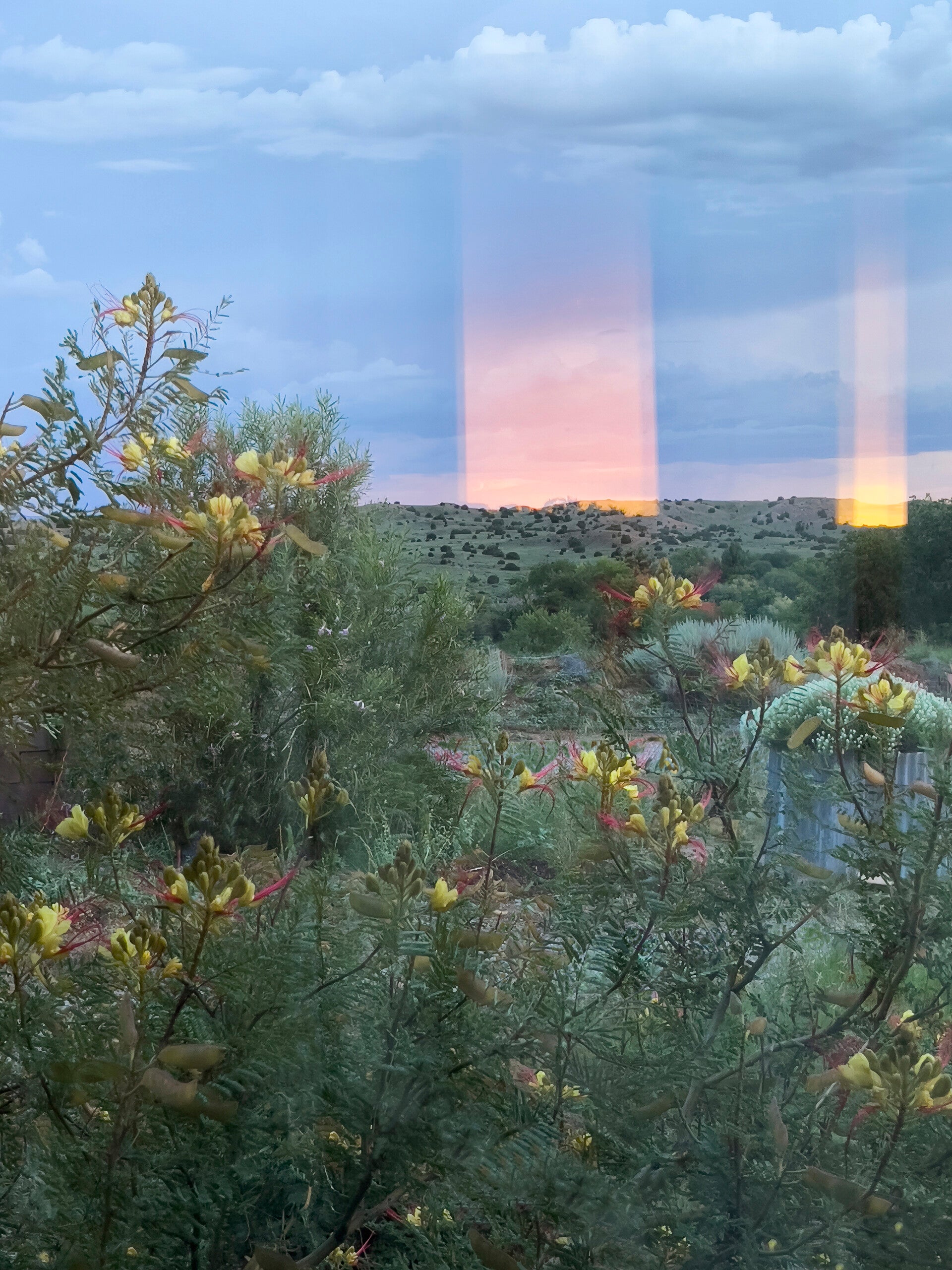 Laurie Tümer has taught in the Photography Department at Santa Fe Community College for several decades. She teaches these online courses: Camera Use & the Art of Seeing and History of Photography. She has a B.A. from the University of Arizona and an M.F.A. from Vermont College, a satellite of California Institute of the Arts in Los Angeles. Laurie grew up in Central L.A. and has lived in the Española area since 1988. Self-published books of her photographs and text include Night Writer and Clouds. Her memoir Heirlooms will be released in 2026. She is represented by photo-eye Gallery in Santa Fe. She is showing photographs from her new series Homebound. Her gardens and building designs are backdrops for a photographic diary of her time homebound since 2010 due to multiple sclerosis. Photographing and gardening are some of her most potent antidotes for pain and mood. Laurie is using an iPhone. None of these scenes are arranged for the camera. In a floor case, she is showing Vol. I of her series Cultivated Subjects, 2000-2025, scanned Polaroid Transfers of gourds she grows. She learned to make Polaroid Transfers in 2000 from Siegfried Halus who founded and then headed the SFCC fine arts program for many years. Laurie was early to digital technology and her scanned and enlarged one-of-a-kind images were at odds with what was accepted at that time, so she put these aside. Years later Anne Kelly, former director of photo-eye Gallery came to her studio and encouraged her to reprint and show these. These folios were made by Santa Fe bookmaker and designer Rosalia Galassi.
