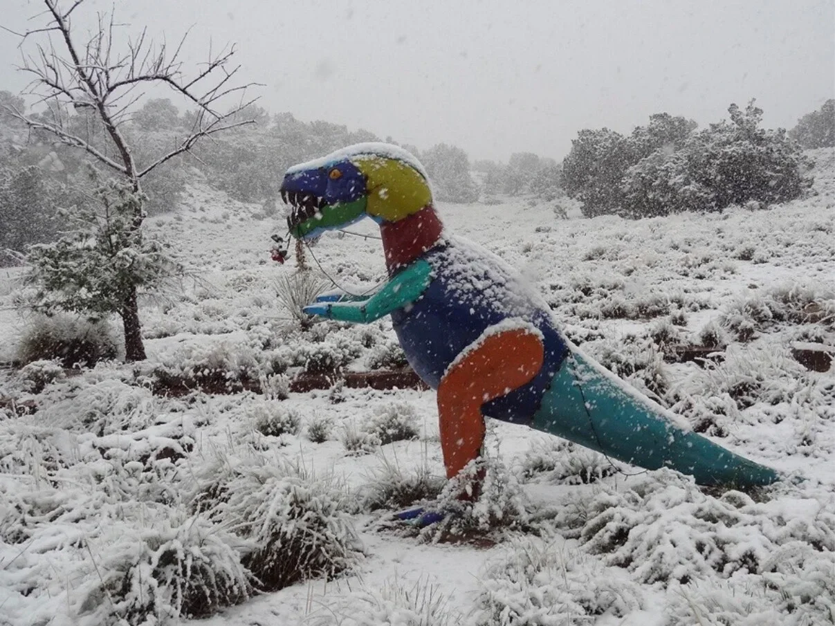 Steve Fitch earned a B.A. in Anthropology from the University of California, Berkeley in 1971 and a M.A. in Fine Art Photography from the University of New Mexico in 1978. Steve’s interest in dinosaurs and neon signs come from the photographs he took of them that became his first book, Diesels and Dinosaurs: Photographs from the American Highway. Steve learned to fabricate neon signs and uses them as garden ornaments. The large dinosaur in his garden is named “Big Girl” after the name his sons gave to his mother. It was bought from a roadside vendor while he was driving back from California after a memorial service for his mother “Big Girl” who died in 2016. His latest book was released in late 2025: The American Drive-in Theater. His photographs have been widely collected and exhibited. He received three National Endowment for the Arts awards as well as the Eliot Porter Fellowship in 1999. In 1981 Steve and his wife, Lynn, acquired rural land in Santa Fe County and over three decades built an off-grid passive solar adobe house, studio, and greenhouse with supplemental solar panels. They made stone structures for collecting rainwater to use in their house and to water the native vegetation they planted such as buffalo and sacaton grasses, trees, and shrubs like New Mexico Locust, Chokecherry, New Mexico Privet, and sagebrush. They imagined their plants and ornaments would dissolve into the natural surroundings. And they do.